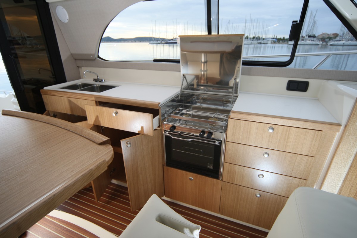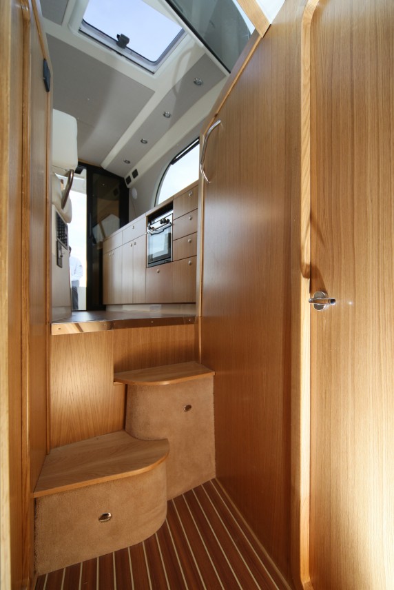 An interesting detail is that the refrigerator is not located within the galley unit, but instead placed beneath the seating area. The entire galley countertop is made of a durable artificial material resistant to wear and very easy to maintain, and its light color perfectly complements the light oak wood used for all interior wooden elements.