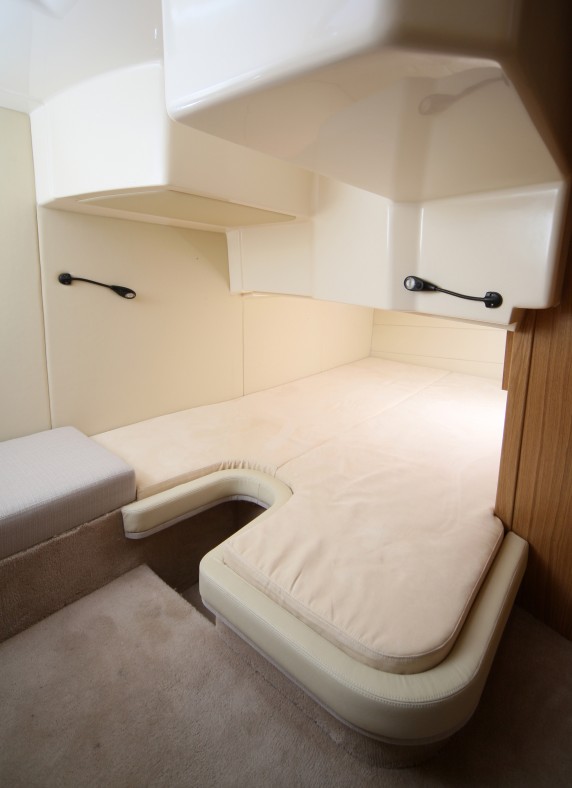 As an example, we will describe one of the layout options: a vessel with two cabins and one bathroom, a version that could be considered the “owner’s layout” due to its comfort in both the cabins and the bathroom. The central part of the bow cabin is occupied by a double bed measuring 210 cm in length and 140 cm in width, satisfying even the most demanding users. It is positioned almost transversely, leaving enough space for two large wardrobes and a small upholstered seat. Along the starboard side is the second cabin, which in this version occupies almost the entire width of the vessel. In the section beneath the helm station and part of the salon seating area, there is a low cabinet and a seat, while the double bed, measuring a full 240 cm in length, is located under the salon and positioned transversely. The port side is reserved for the bathroom area, consisting of two sections: one with a sink and toilet, and a large separate shower cabin. Additionally, there are cabinets and shelves for storing toiletries and essentials. All areas within the cabins, bathroom, and salon are very bright and comfortable, thanks to the abundance of windows located throughout the vessel—on the hull, cabin sides, deck, and even two on the salon roof.