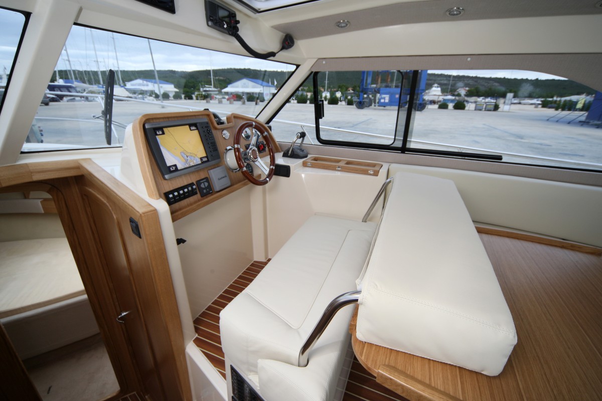 The helm station, as previously mentioned, is located on the starboard side. It is ergonomically well-designed, with excellent visibility in all directions, thanks primarily to large glass surfaces and slim roof supports. Above the steering wheel—whose size and design are perfectly suited for this type and size of vessel—there is a nearly vertical panel with all the instruments necessary for safe and comfortable navigation. In addition to engine monitoring instruments, there is a large multifunction display for the electronic navigation system (optional). It provides GPS and depth sounder data, as well as information on fuel consumption, distance traveled, fuel levels, battery voltage, and many other useful parameters.