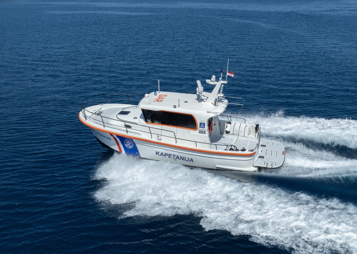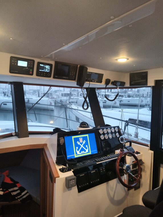 The interior is accessed from the spacious cockpit through large glass doors. On the port side, there is a table with a bench used for writing reports and handling administrative tasks, while in front of it are two comfortable helm seats. Large side doors are located on both sides of the interior, allowing quick and easy access from the cabin to the deck. The vessel is robust and powerful, with plenty of engine power. It is equipped with a 24-volt bow thruster with an AC motor, which significantly facilitates maneuvering for the crew. In front of the helm and co-helm seats are two Furuno displays, along with a compass, depth sounder, echo sounder, and radio communication system. The vessel is equipped with an X-band HD radar with an open antenna and a range of 72 nautical miles. The radar includes target tracking and analysis, as well as automatic display of dangerous targets, and is operated via a control panel located on the console in front of the helmsman. Additional equipment includes a portable searchlight, radar reflector, and weather station.